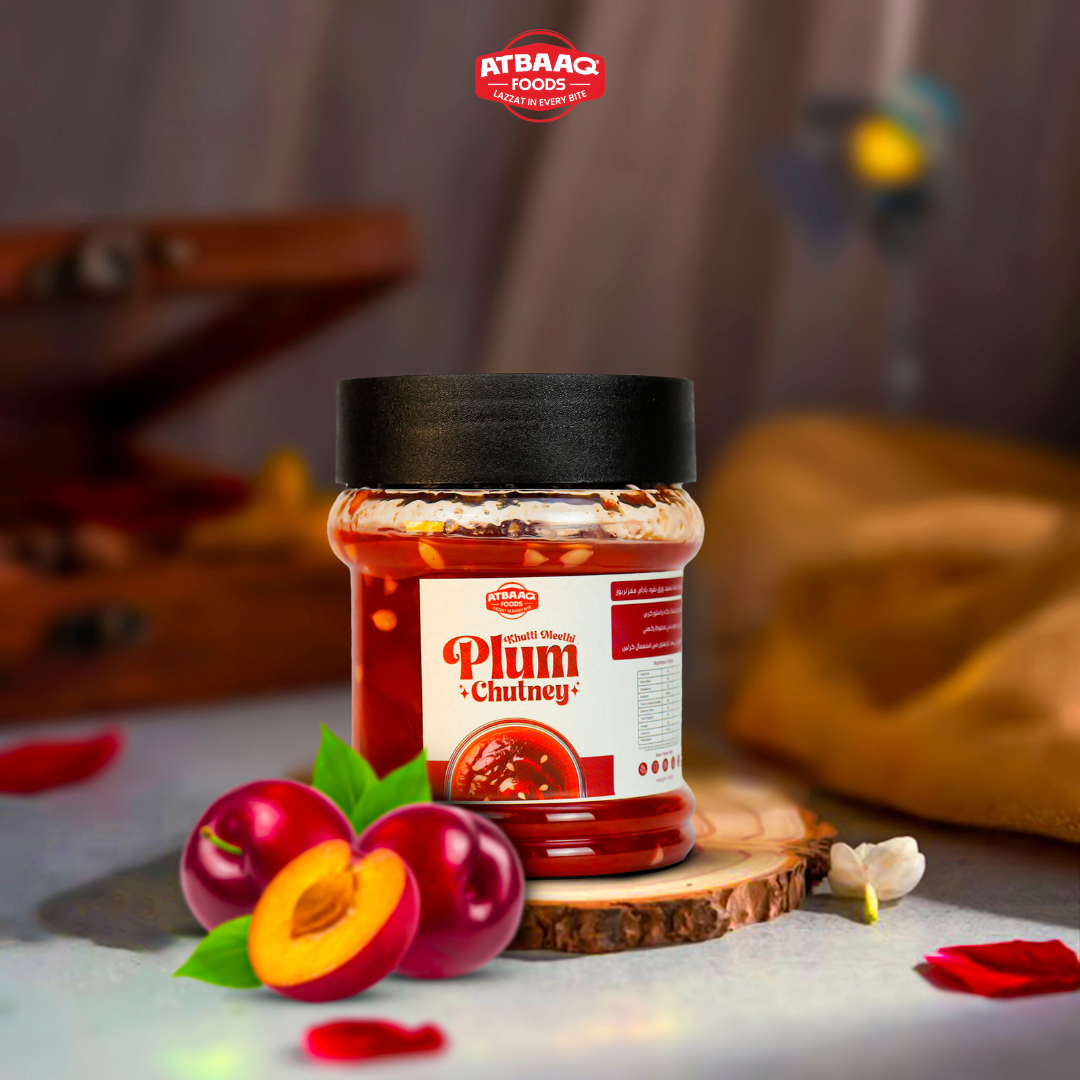 Khatti Meethi Plum Chutney by Atbaaq Foods is a delicious blend of tangy and sweet flavors, prepared using premium dried plums, sugar, almonds, and edible silver leaf (chandi warq). Carefully crafted with high-quality ingredients, this chutney offers a rich taste and smooth texture that enhances every meal.